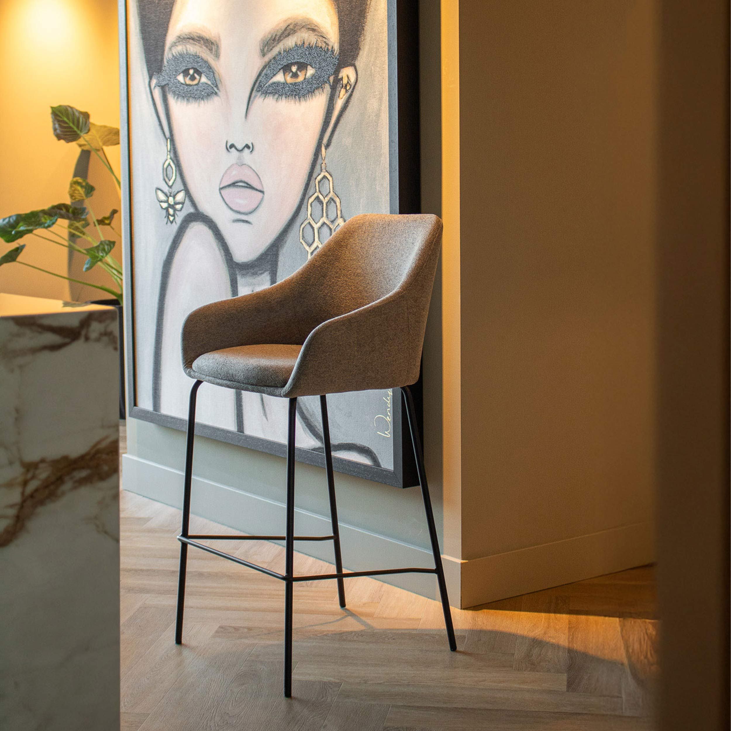 Auf der Suche nach einem Barhocker, der Komfort und Eleganz mühelos vereint? Dann ist der KICK Barhocker SUUS genau das Richtige für Sie. Dieser stilvolle Barhocker hat ein modernes Aussehen mit einem melierten Textilbezug, der für einen warmen, luxuriösen Look sorgt. Die bequeme Sitzfläche mit Armlehnen lädt zum langen Verweilen ein und eignet sich perfekt für Ihre Kücheninsel, Bar oder Ihren hohen Esstisch.