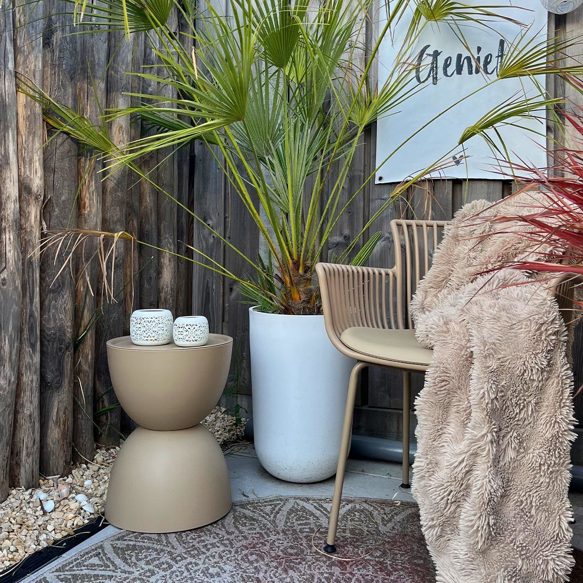 Verschönere deinen Garten mit dem Beistelltisch TESS von KICK. Dieser trendige Beistelltisch verleiht jedem Garten, Balkon oder Wohnzimmer sofort eine frische und verspielte Ausstrahlung. Dank seines modernen Designs mit runden Formen ist TESS ein echter Blickfang, der sich mühelos in verschiedene Einrichtungs- und Gartenstile einfügt.