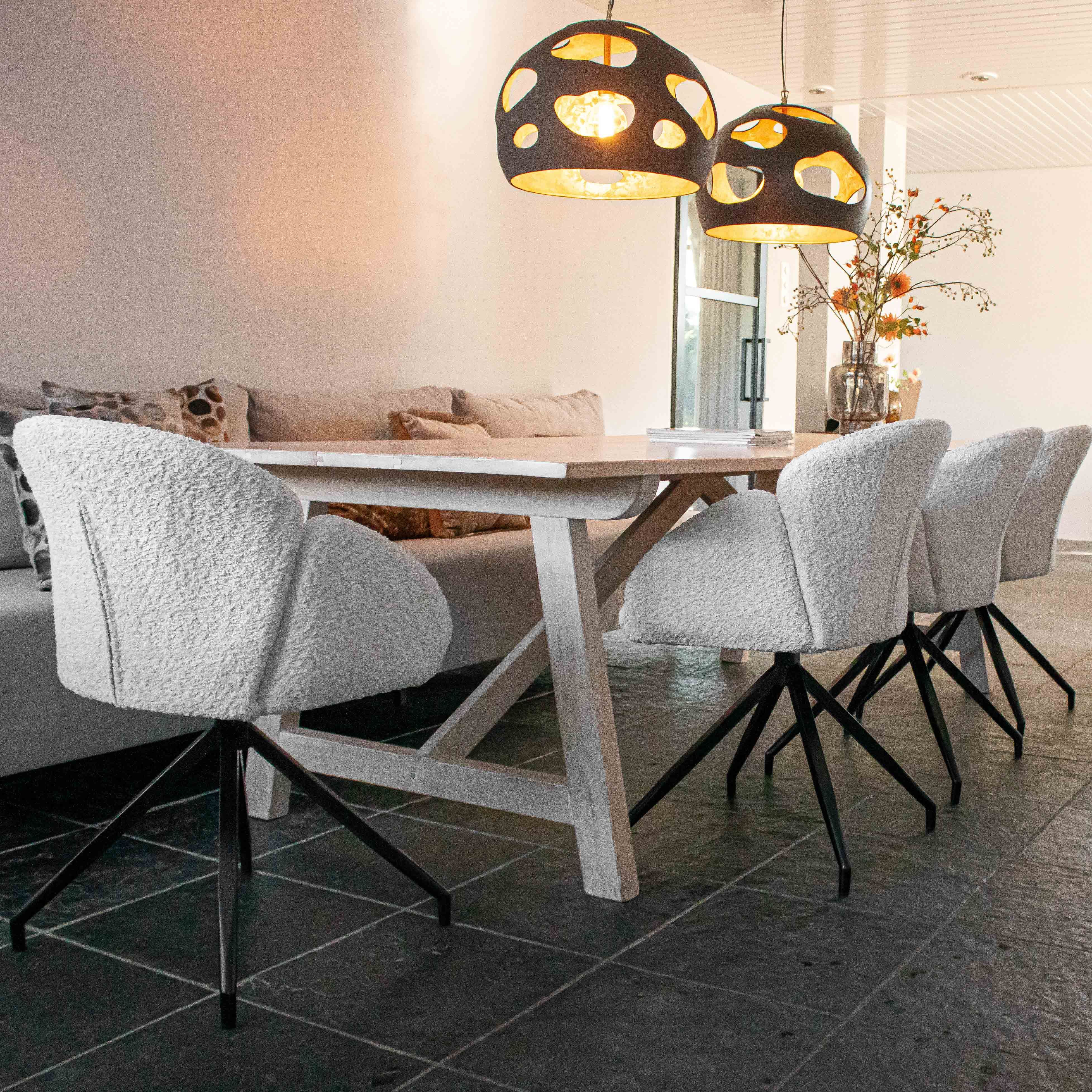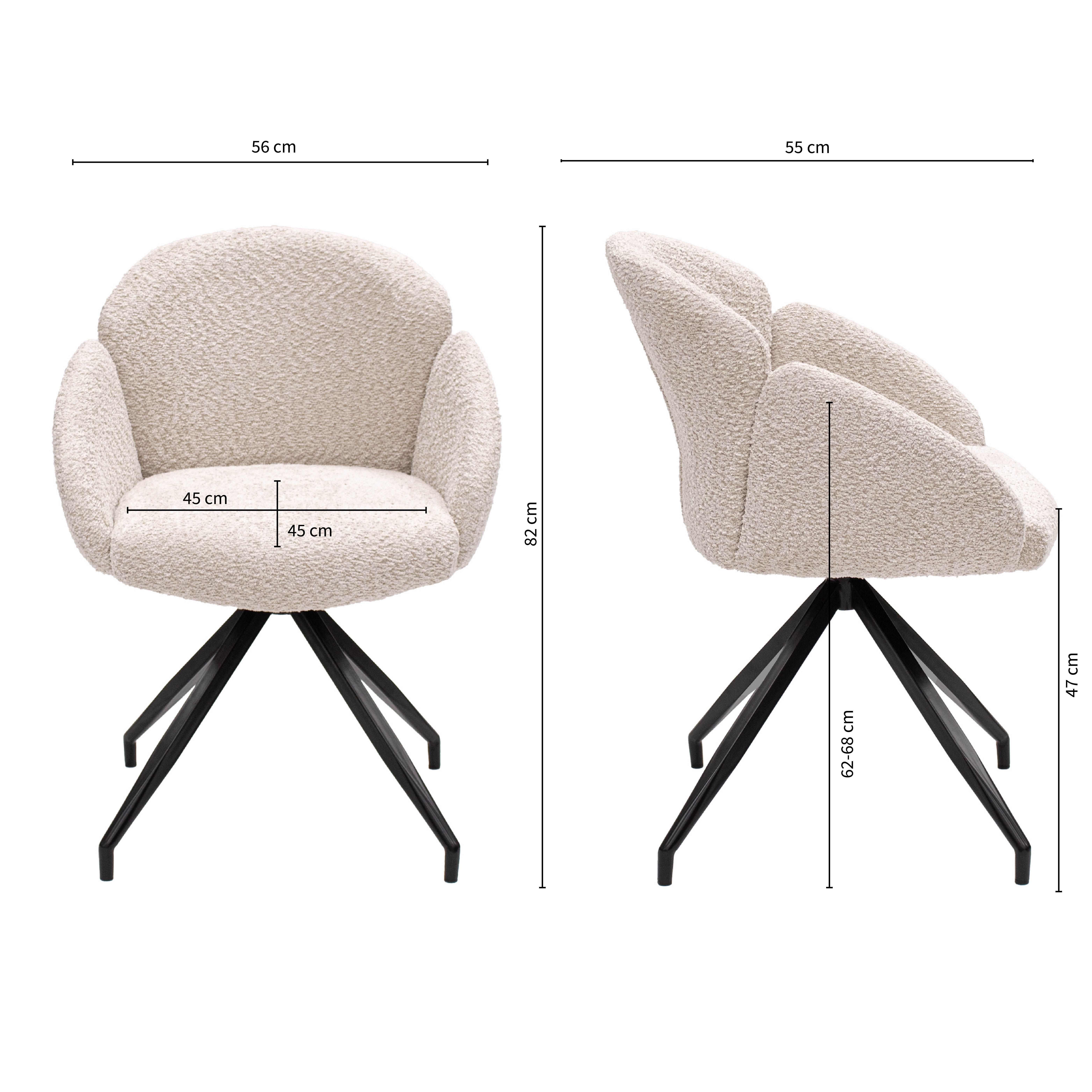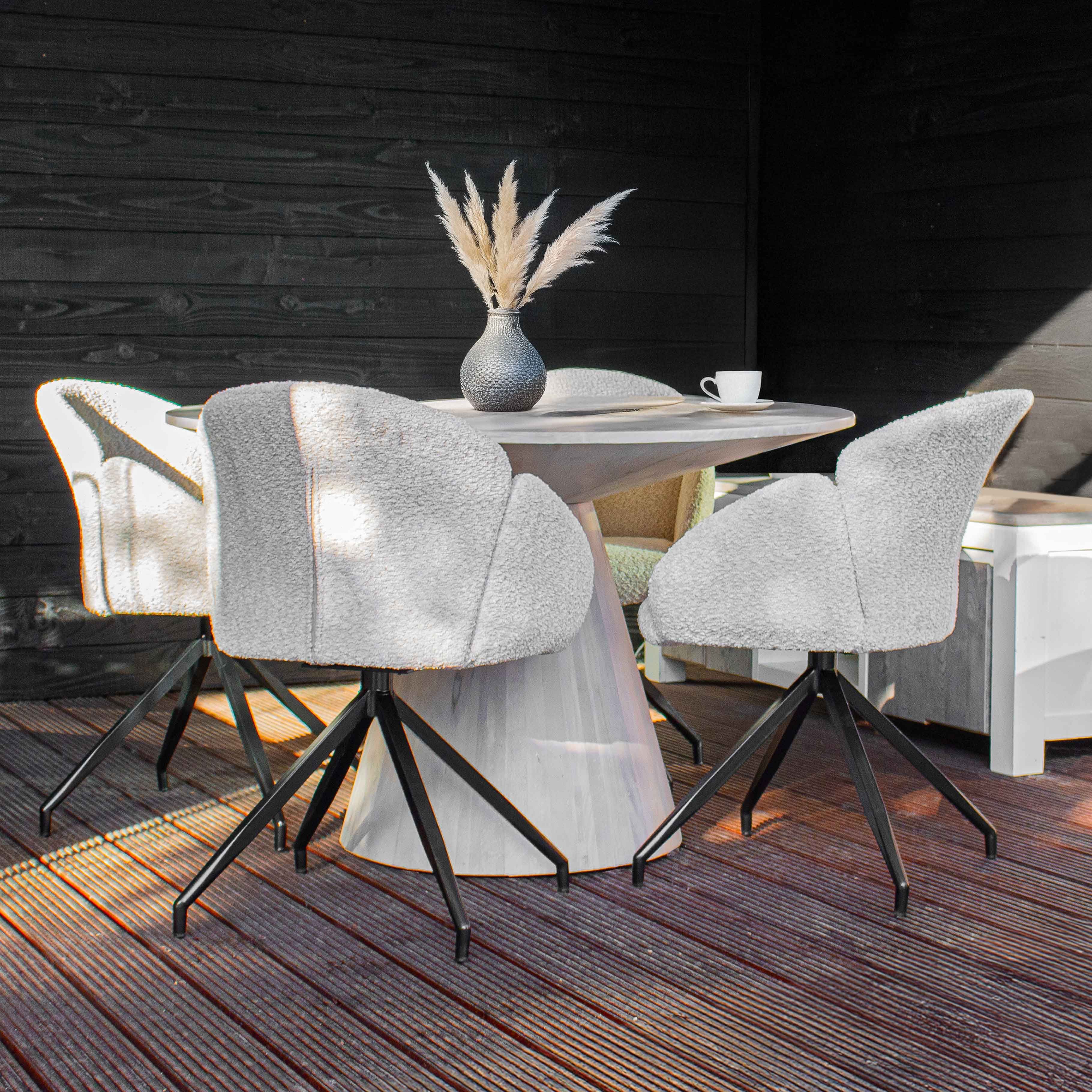 Suchen Sie einen Drehstuhl, der Komfort, Design und Funktionalität perfekt vereint? Dann ist der Drehstuhl AIKO von KICK genau das Richtige für Sie. Dieser elegante Stuhl ist mit einem weichen Bouclé-Stoff bezogen, der ihm ein warmes und luxuriöses Aussehen verleiht. Das schwarze Metallgestell ist um 180° drehbar und kehrt automatisch in seine Ausgangsposition zurück – superpraktisch und stilvoll!