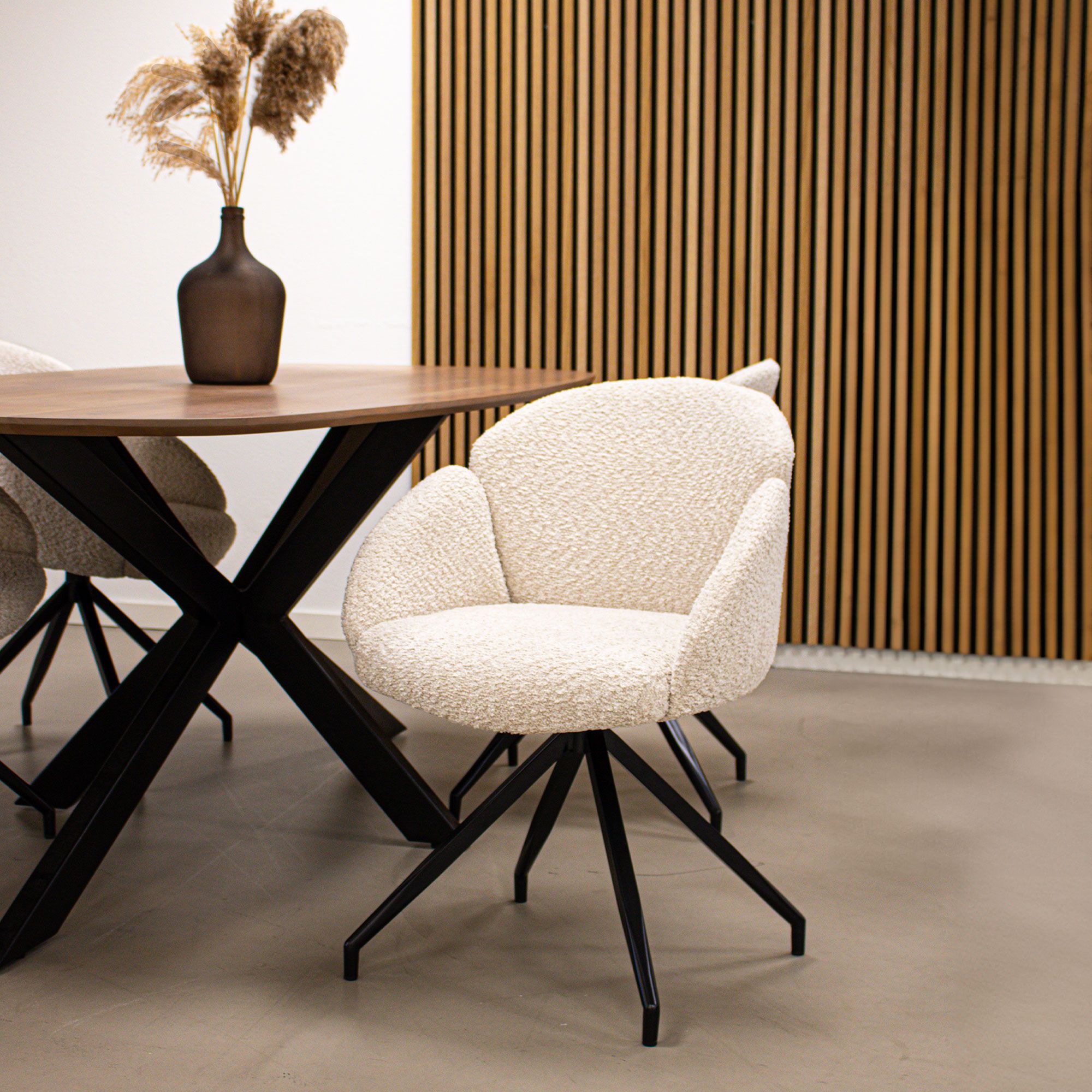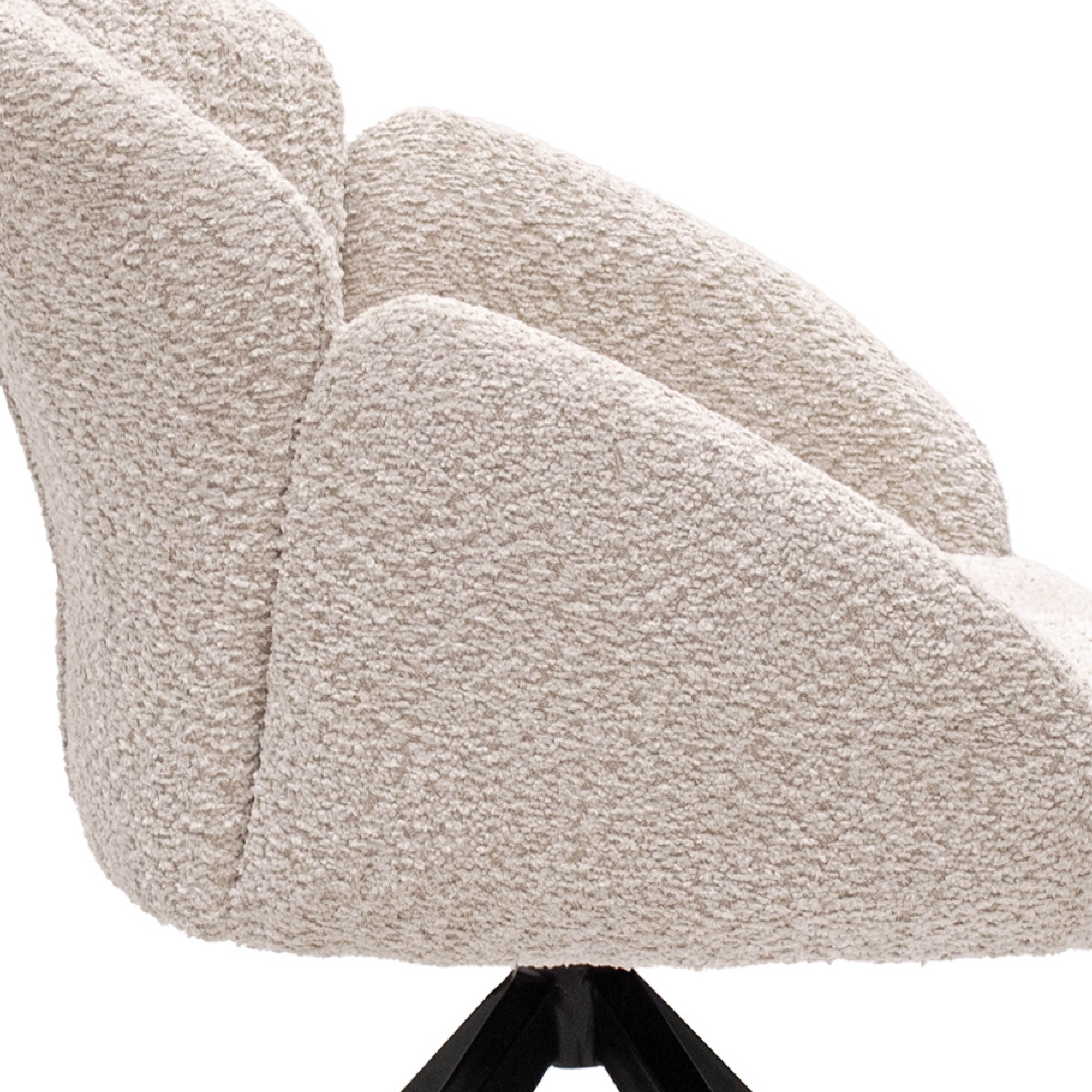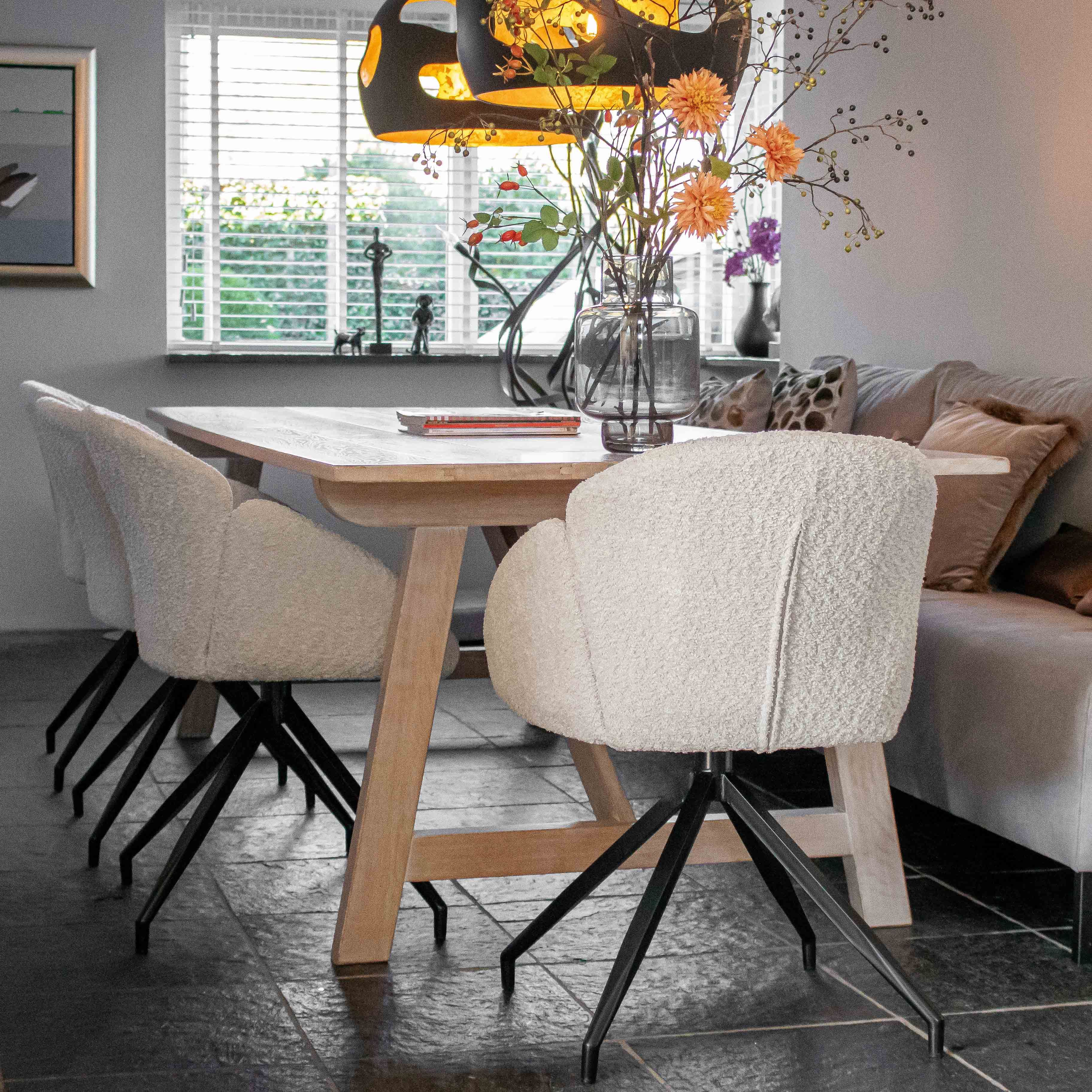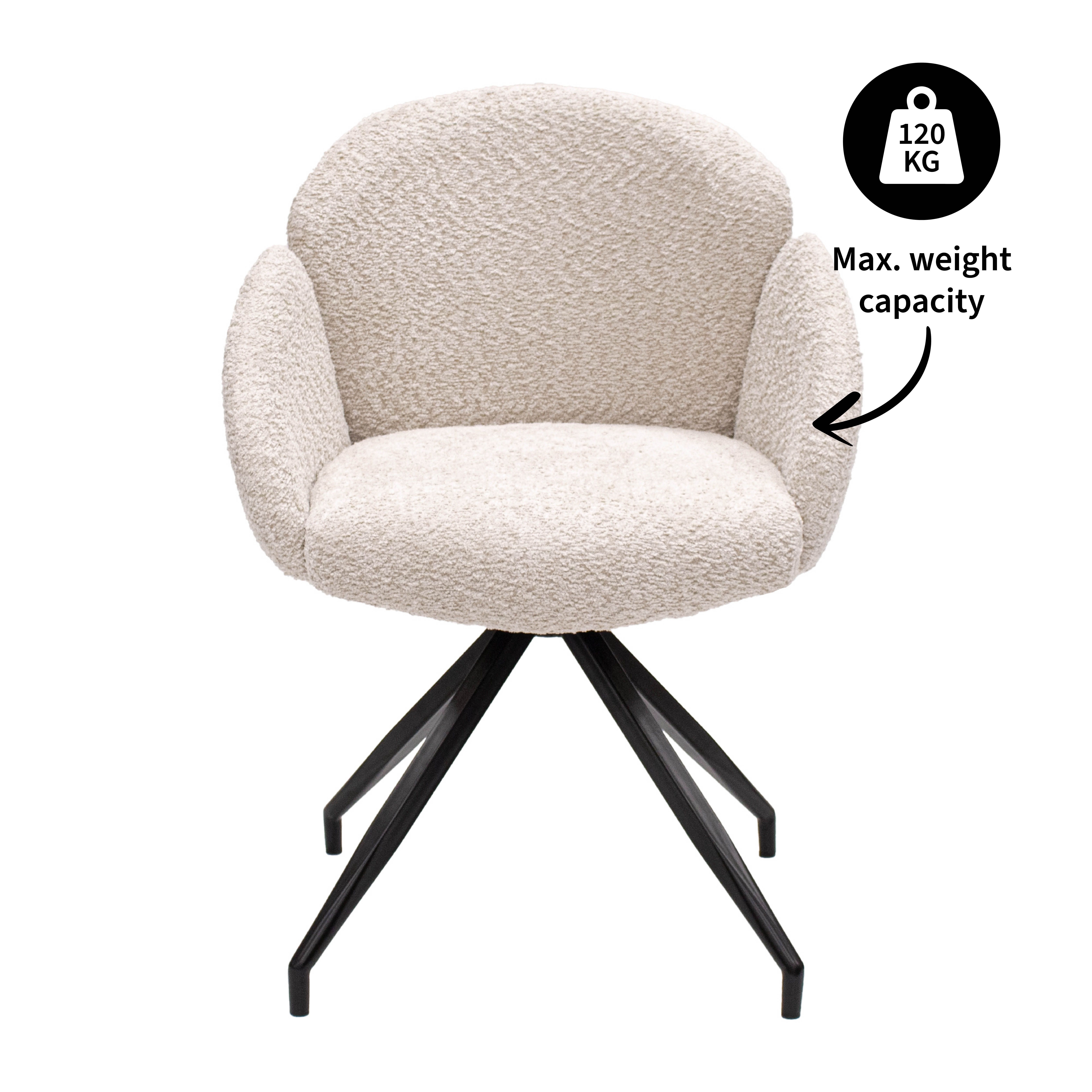 Suchen Sie einen Drehstuhl, der Komfort, Design und Funktionalität perfekt vereint? Dann ist der Drehstuhl AIKO von KICK genau das Richtige für Sie. Dieser elegante Stuhl ist mit einem weichen Bouclé-Stoff bezogen, der ihm ein warmes und luxuriöses Aussehen verleiht. Das schwarze Metallgestell ist um 180° drehbar und kehrt automatisch in seine Ausgangsposition zurück – superpraktisch und stilvoll!