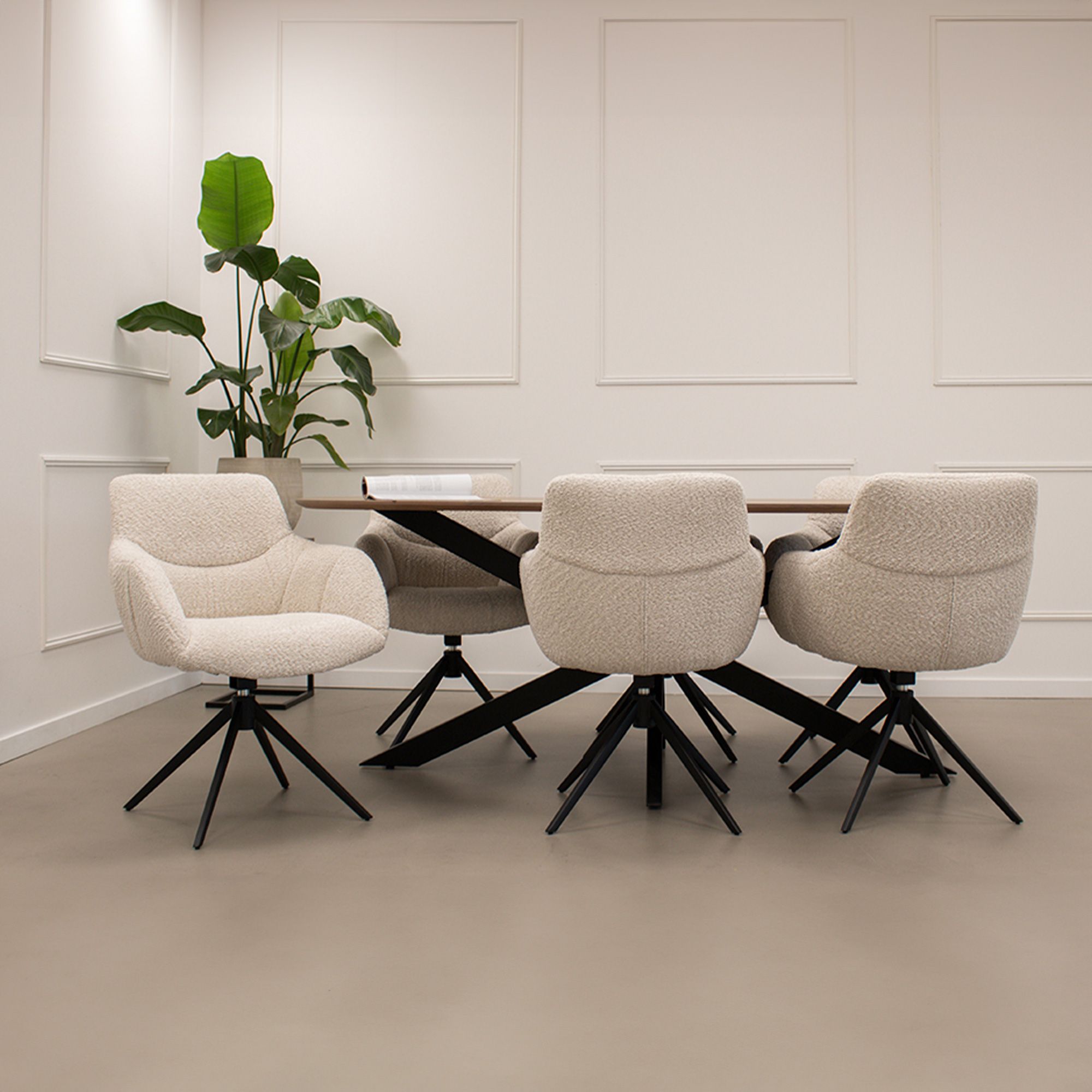 Das praktische, um 360 Grad drehbare Gestell macht Fer nicht nur schön, sondern auch funktional. Besonders praktisch: Das Gestell dreht automatisch in die Ausgangsposition zurück – ideal für einen aufgeräumten Look rund um den Tisch. Ob lange Dinnerabende oder gesellige Runden mit Freunden, mit Fer sitzen Sie immer bequem.