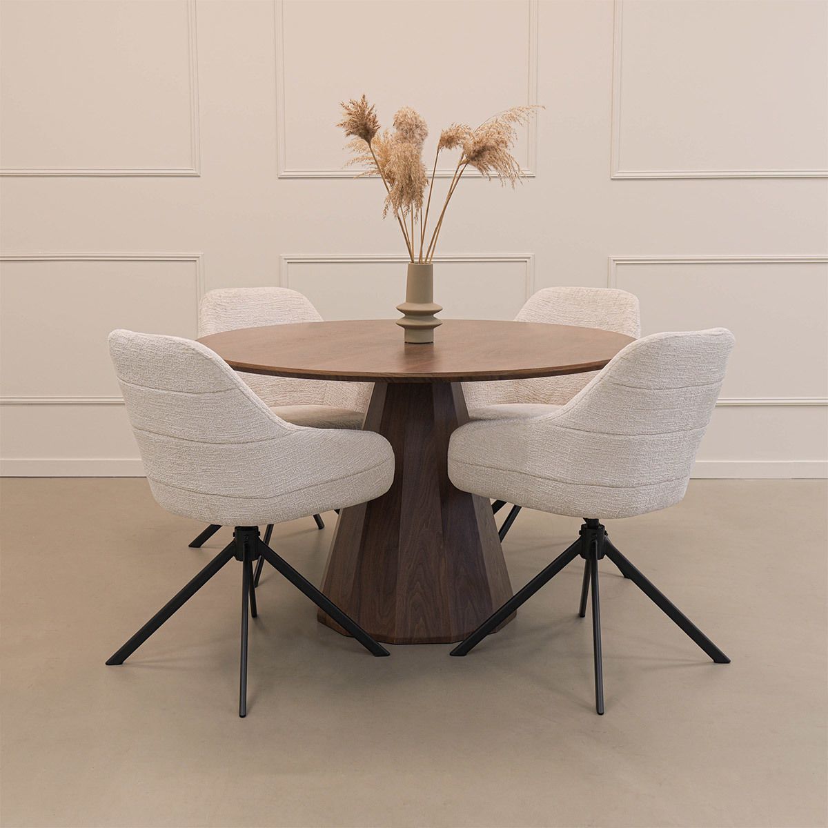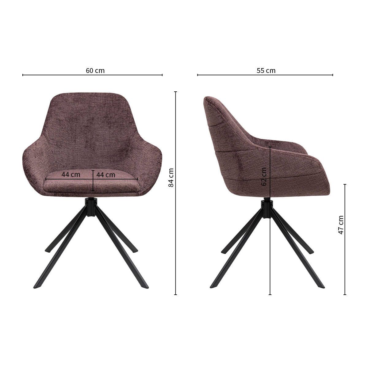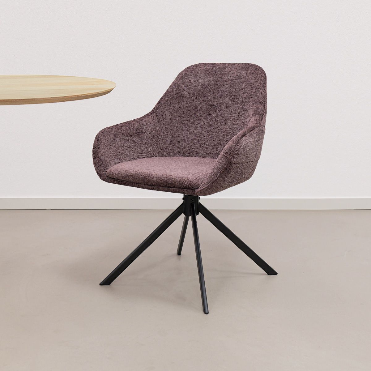 Der weiche Textilbezug verleiht JULE ein luxuriöses Aussehen, während das Metallgestell für eine stabile Basis sorgt. Die horizontalen Nähte in der Rückenlehne sind ein subtiles, aber auffälliges Detail und verleihen dem Stuhl einen verspielten und raffinierten Charakter. Dank der 360-Grad-Drehfunktion mit automatischer Rückstellfunktion genießen Sie zusätzliche Bewegungsfreiheit, während die bequemen Armlehnen für ein entspanntes Sitzerlebnis sorgen.