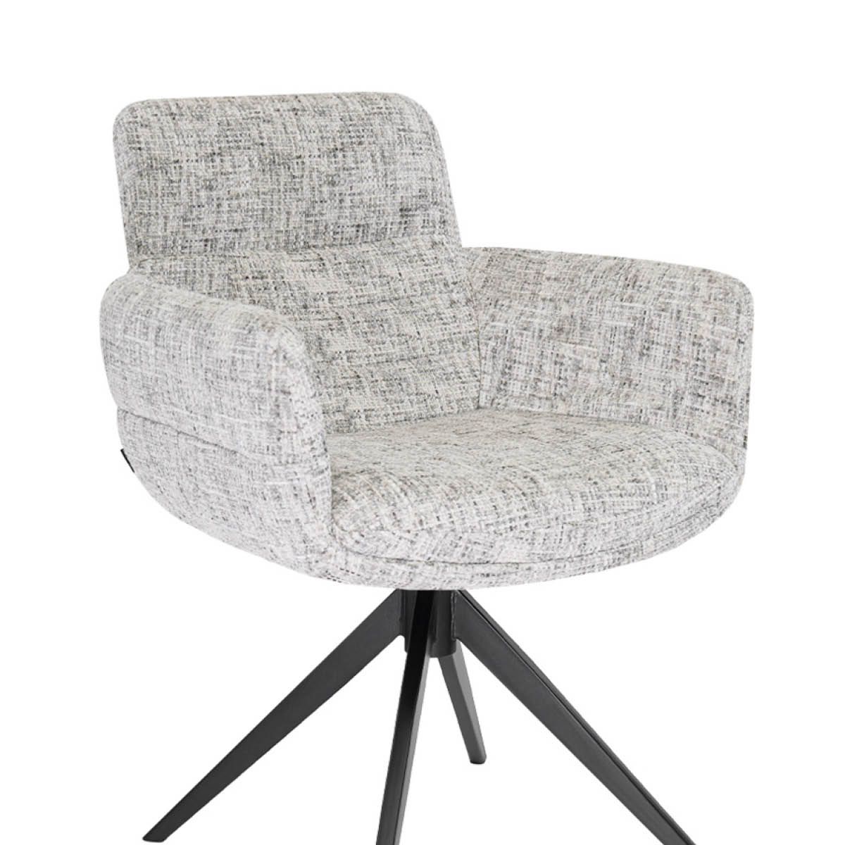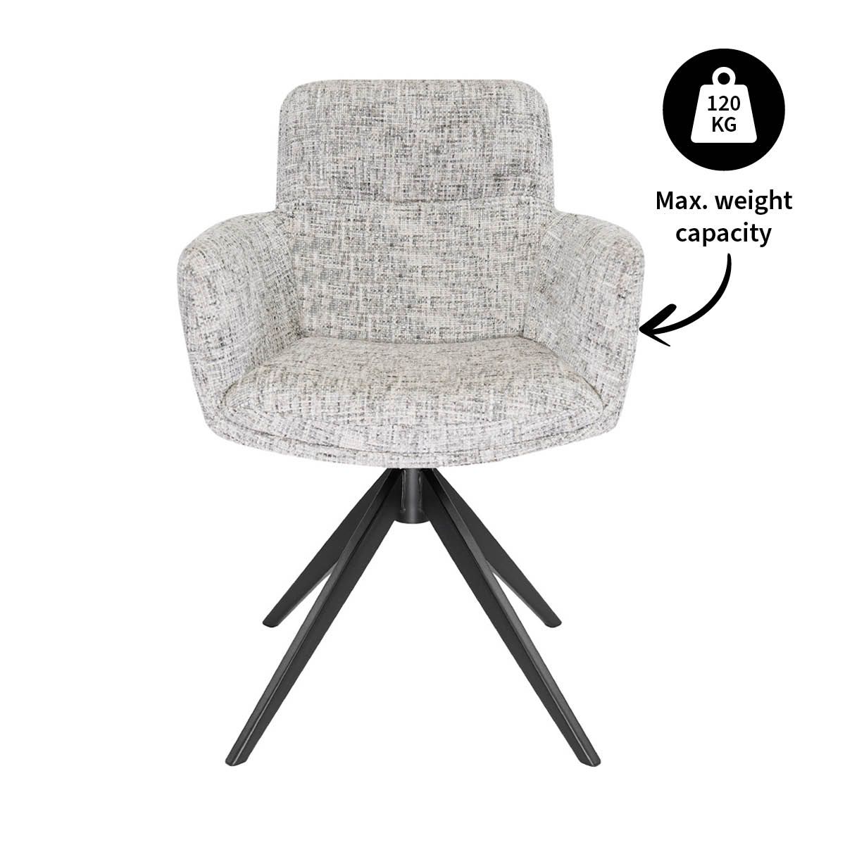Dank der vollen Sitzpolsterung, der bequemen Rückenlehne und den stützenden Armlehnen sitzen Sie immer richtig – egal, ob Sie lange am Tisch sitzen oder einen Arbeitstag zu Hause verbringen. Das um 360 Grad drehbare Untergestell mit automatischer Rückstellfunktion sorgt für zusätzlichen Komfort, während das schwarze Metallgestell eine moderne und luxuriöse Basis bildet.