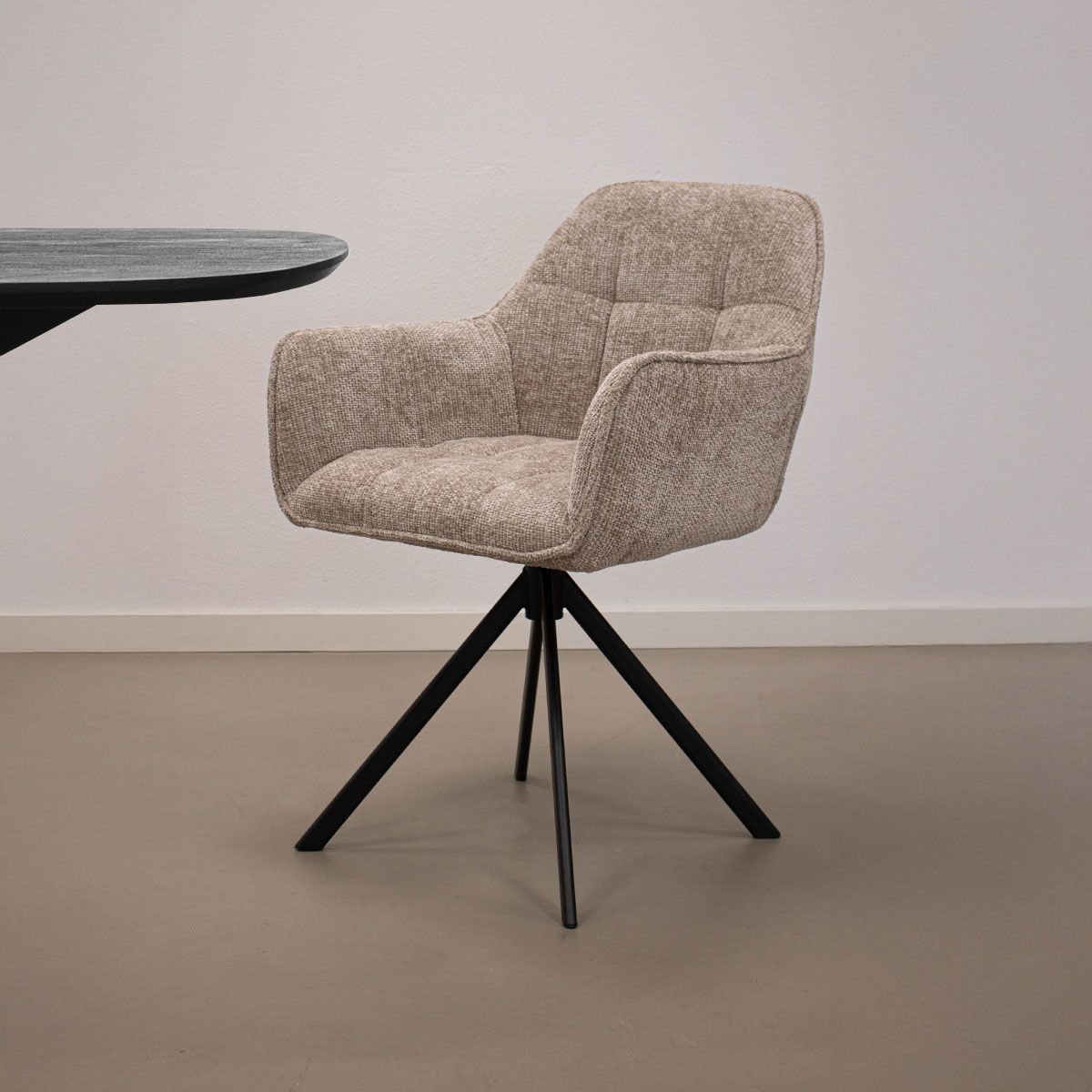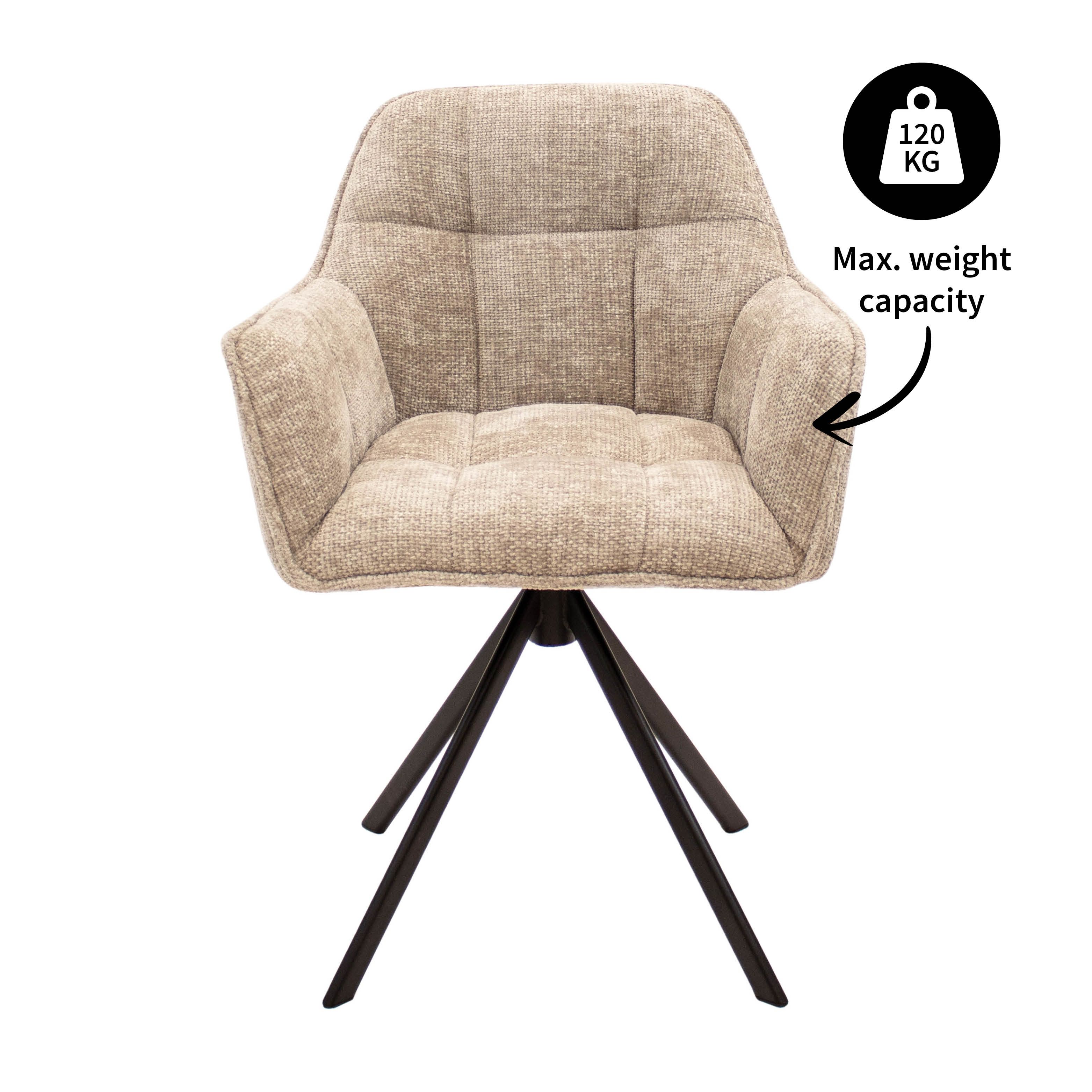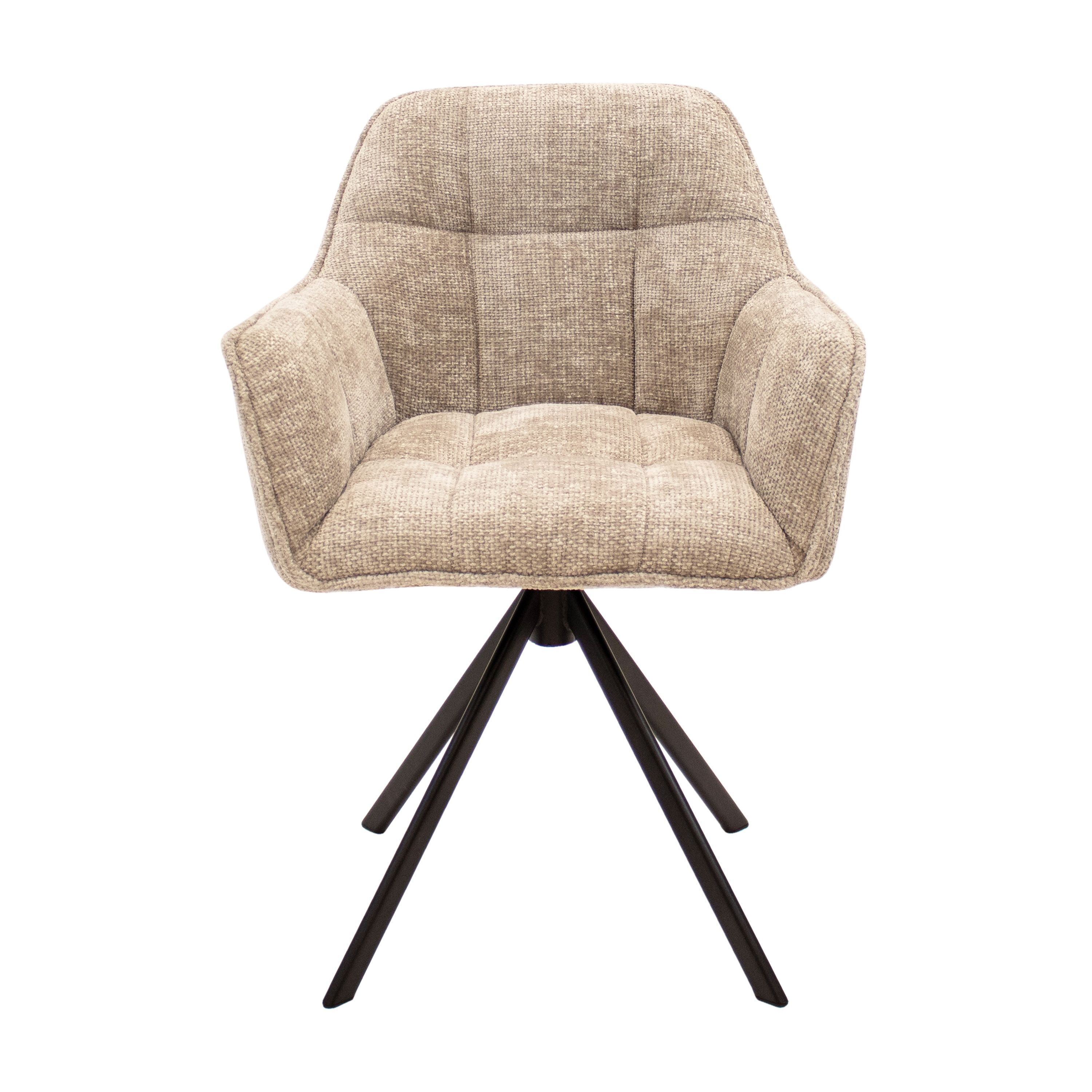 LUC ist die perfekte Mischung aus Komfort, Stil und Funktionalität. Mit seinem um 180 Grad drehbaren Untergestell sorgt LUC nicht nur für Bewegungsfreiheit am Tisch, sondern auch für einen modernen Touch in Ihrer Einrichtung. Die luxuriöse Ausstrahlung des groben Chenille-Stoffes sorgt für eine warme, einladende Atmosphäre, während die Armlehnen zusätzlichen Komfort bei langen Abendessen oder gemütlichen Abenden bieten.