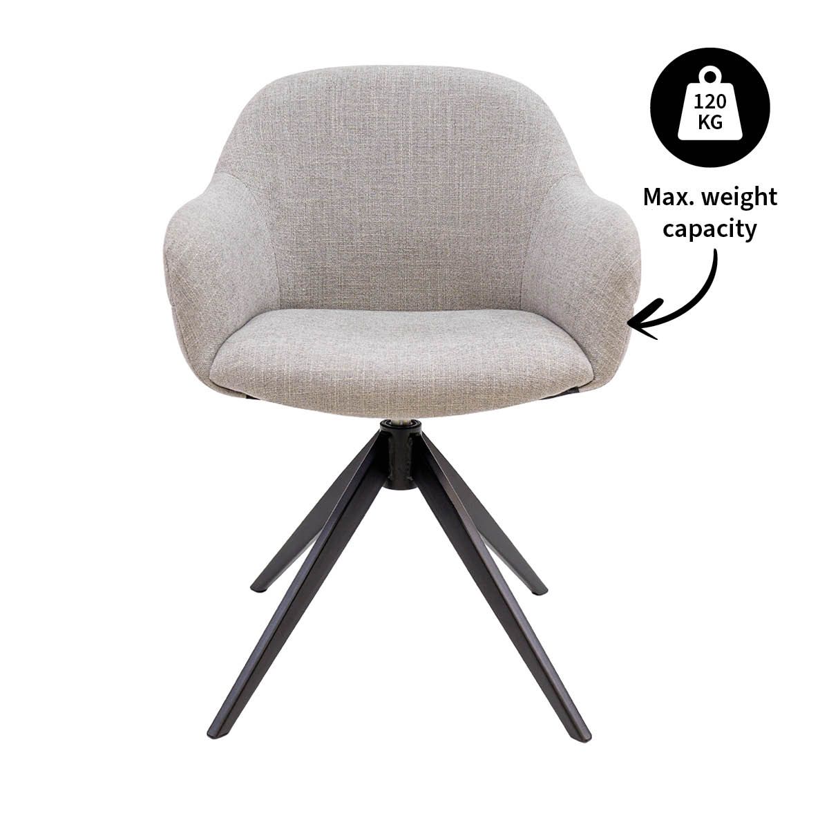 Das um 360 Grad drehbare Untergestell mit automatischer Rückstellfunktion sorgt für zusätzlichen Komfort im täglichen Gebrauch. Ideal für lange Abendessen oder einen Arbeitstag zu Hause. Die schönen horizontalen Nähte auf der Rückseite der Rückenlehne verleihen dem Stuhl einen verspielten Effekt und machen das Design zu etwas Besonderem. Das schwarze Metallgestell bildet einen schönen Kontrast zum weichen Stoff und verleiht NOEL ein modernes, luxuriöses Aussehen.