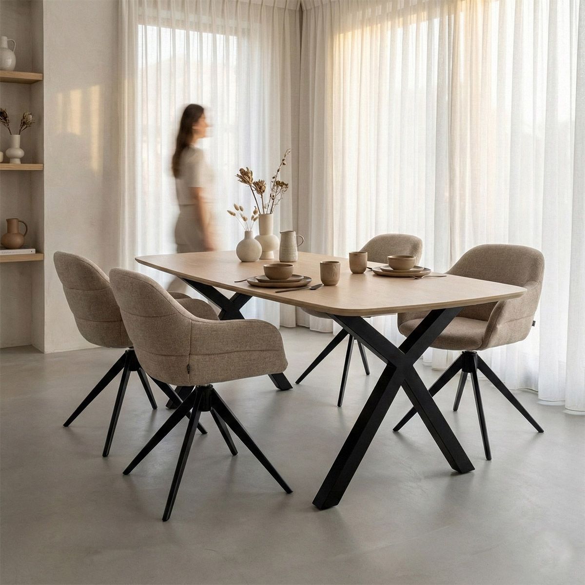Das um 360 Grad drehbare Untergestell mit automatischer Rückstellfunktion sorgt für zusätzlichen Komfort im täglichen Gebrauch. Ideal für lange Abendessen oder einen Arbeitstag zu Hause. Die schönen horizontalen Nähte auf der Rückseite der Rückenlehne verleihen dem Stuhl einen verspielten Effekt und machen das Design zu etwas Besonderem. Das schwarze Metallgestell bildet einen schönen Kontrast zum weichen Stoff und verleiht NOEL ein modernes, luxuriöses Aussehen.