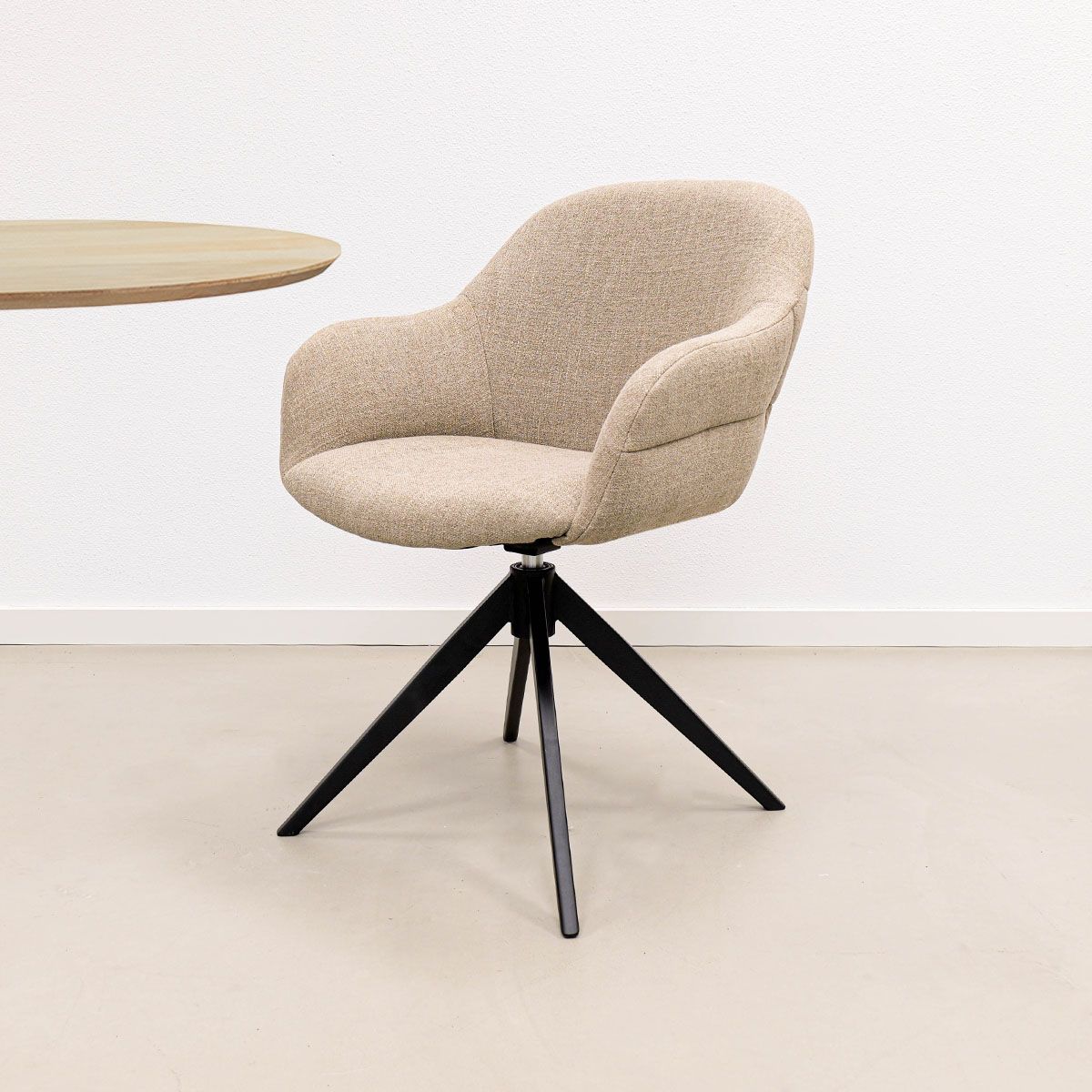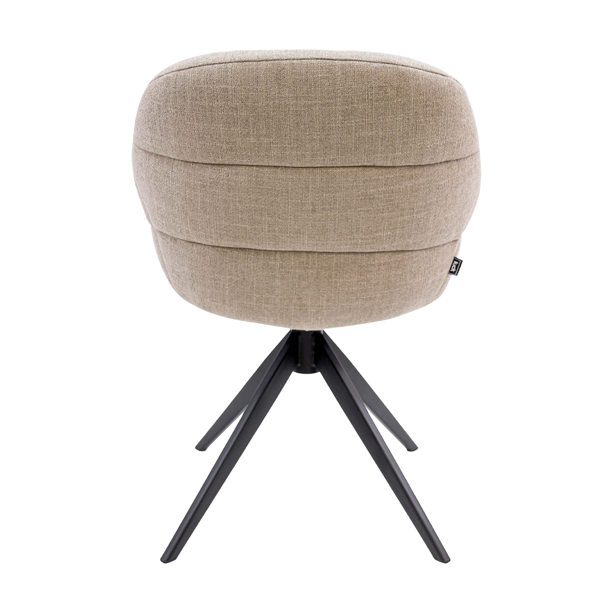 Das um 360 Grad drehbare Untergestell mit automatischer Rückstellfunktion sorgt für zusätzlichen Komfort im täglichen Gebrauch. Ideal für lange Abendessen oder einen Arbeitstag zu Hause. Die schönen horizontalen Nähte auf der Rückseite der Rückenlehne verleihen dem Stuhl einen verspielten Effekt und machen das Design zu etwas Besonderem. Das schwarze Metallgestell bildet einen schönen Kontrast zum weichen Stoff und verleiht NOEL ein modernes, luxuriöses Aussehen.