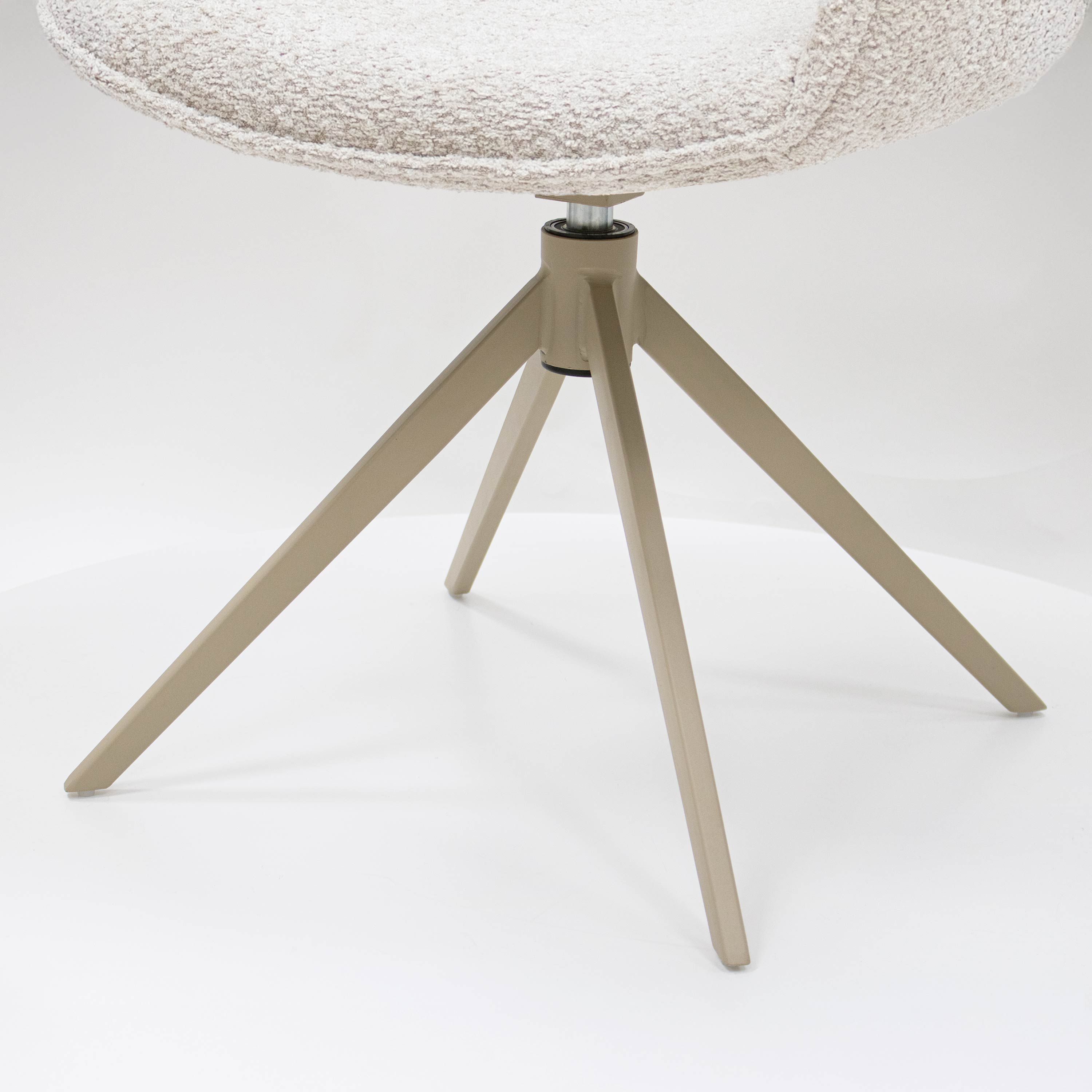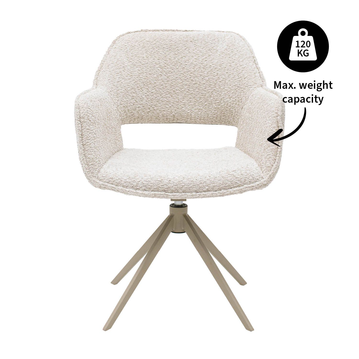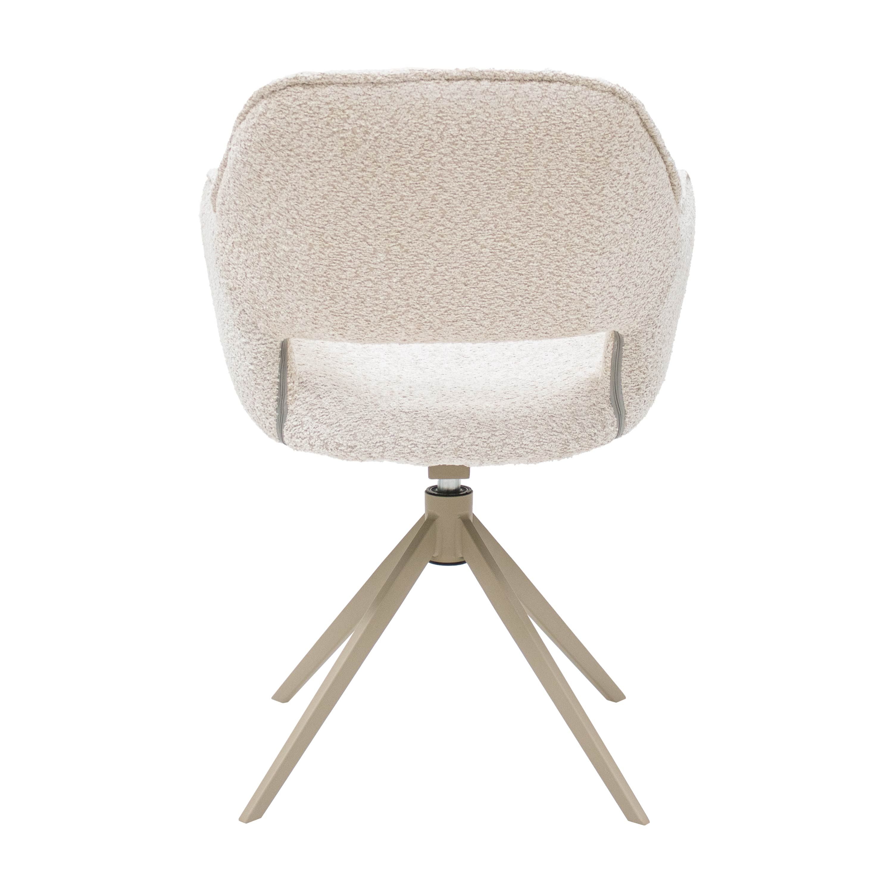 MEET OWEN! Der Drehsessel Owen ist mit einem schönen, weichen Bouclé-Stoff gepolstert, hat eine feine Armlehne und eine Öffnung in der Rückenlehne. Sein Metallgestell und der um 360 Grad drehbare Rahmen, der automatisch in seine ursprüngliche Position zurückkehrt, verbinden Stil mit Benutzerfreundlichkeit. Owen ist in verschiedenen Farben erhältlich!