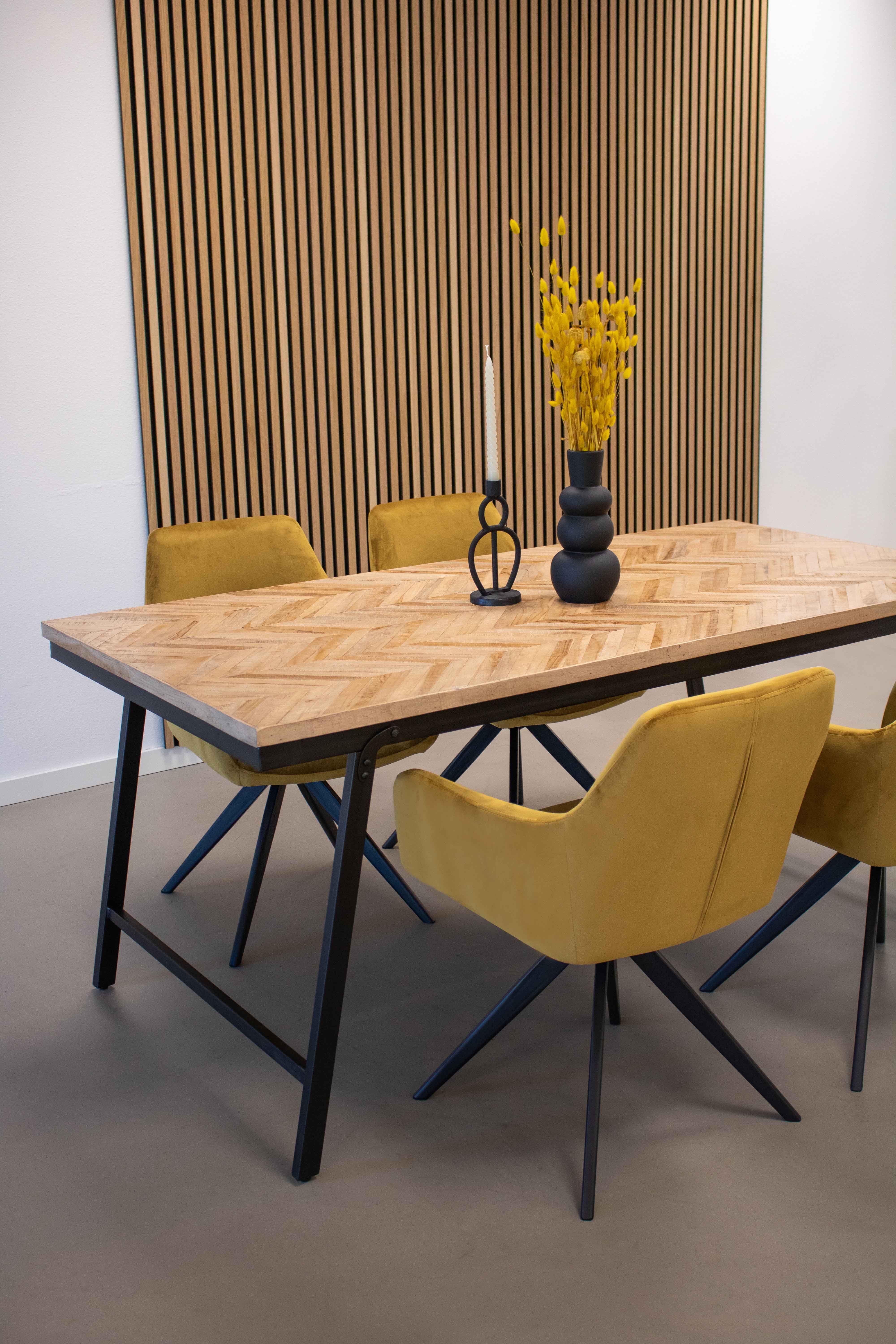 Ein stilvolles Detail ist die horizontale Naht in der Rückenlehne, die dem Stuhl ein besonders elegantes und luxuriöses Aussehen verleiht. Der hochwertige Bezug sorgt für eine warme Ausstrahlung, während der stabile Metallrahmen Stabilität und Langlebigkeit garantiert.