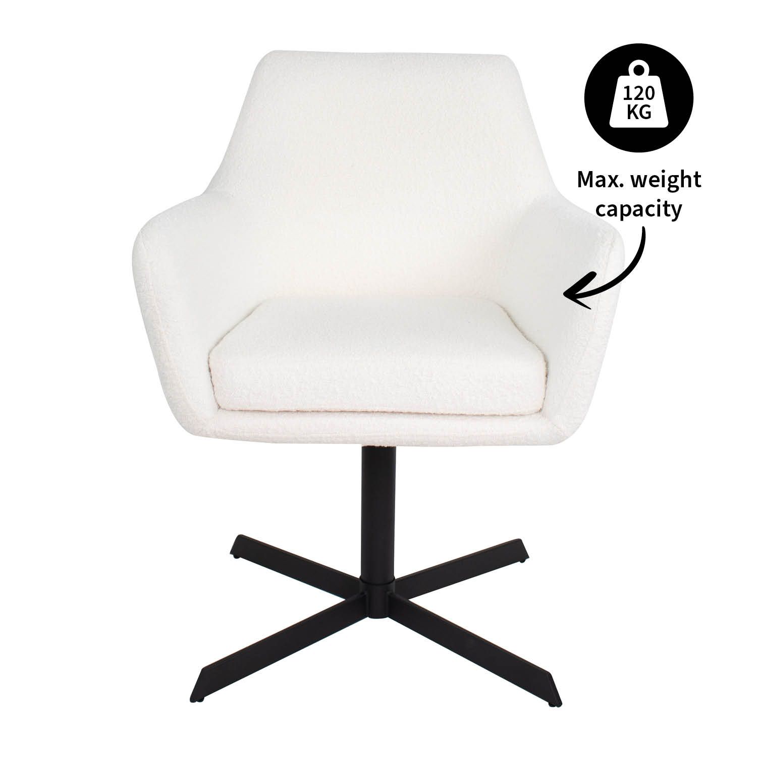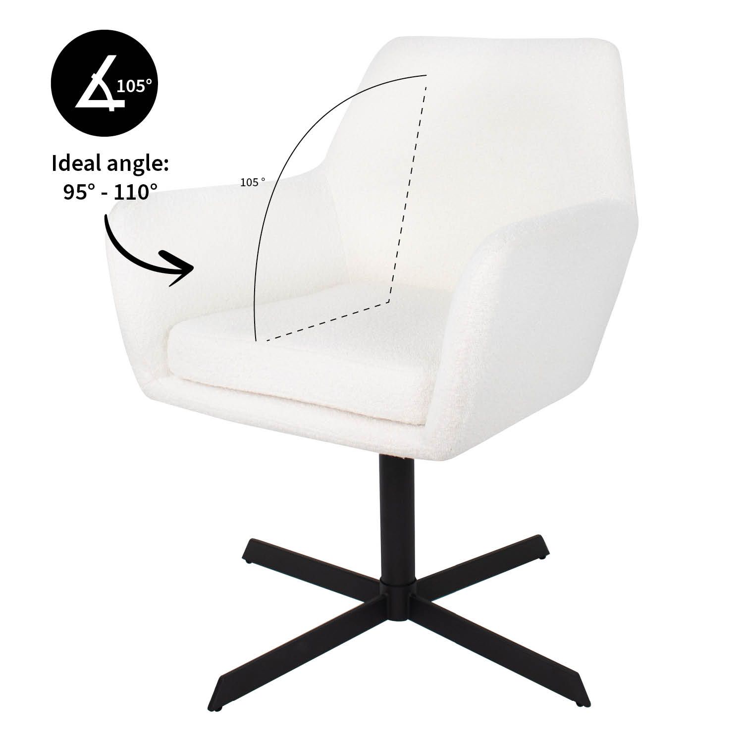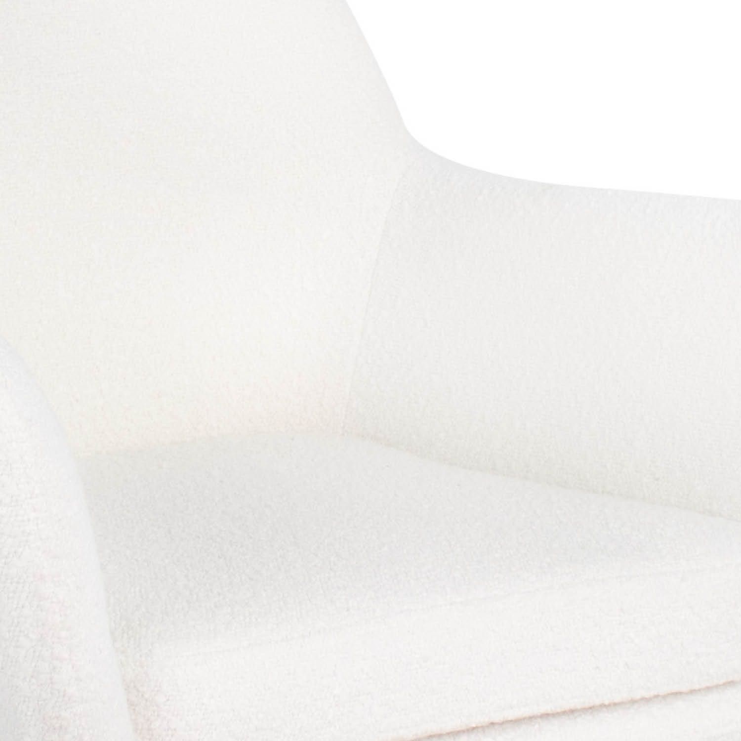 Viktor ist mit einem weichen Bouclé-Stoff umhüllt. Der Stuhl verfügt über gut positionierte Armlehnen, die den Sitzkomfort maximieren. Das markante Metallgestell des Stuhls ist ein Meisterwerk an modernem Design und Funktionalität. Das Gestell ist mit einem 360-Grad-Drehmechanismus ausgestattet, der es Ihnen ermöglicht, sich problemlos zum Esstisch zu bewegen oder ein Gespräch zu führen, ohne den Stuhl zu bewegen.