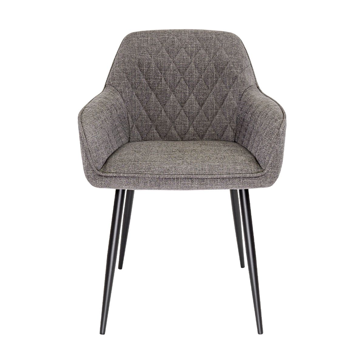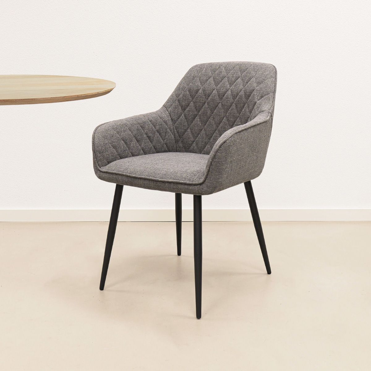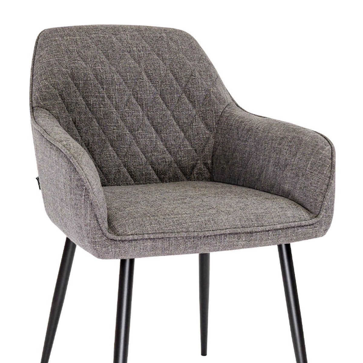 Die abgerundeten Armlehnen sorgen für einen bequemen und einladenden Sitzkomfort, während die gute Rückenlehne optimale Unterstützung bei langen Abendessen bietet. In der Rückenlehne sorgen die Nähte in einem verspielten Rautenmuster für ein subtiles, aber auffälliges Detail. Die Paspelierung entlang der Rückenlehne und der Armlehnen unterstreicht den luxuriösen Charakter und verleiht dem Stuhl ein raffiniertes Finish. Der feine Strukturstoff fühlt sich weich an und trägt zum komfortablen, hochwertigen Sitzgefühl bei.