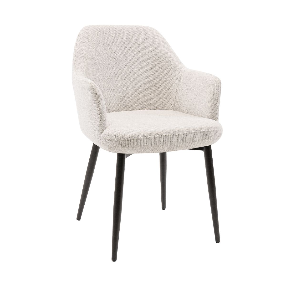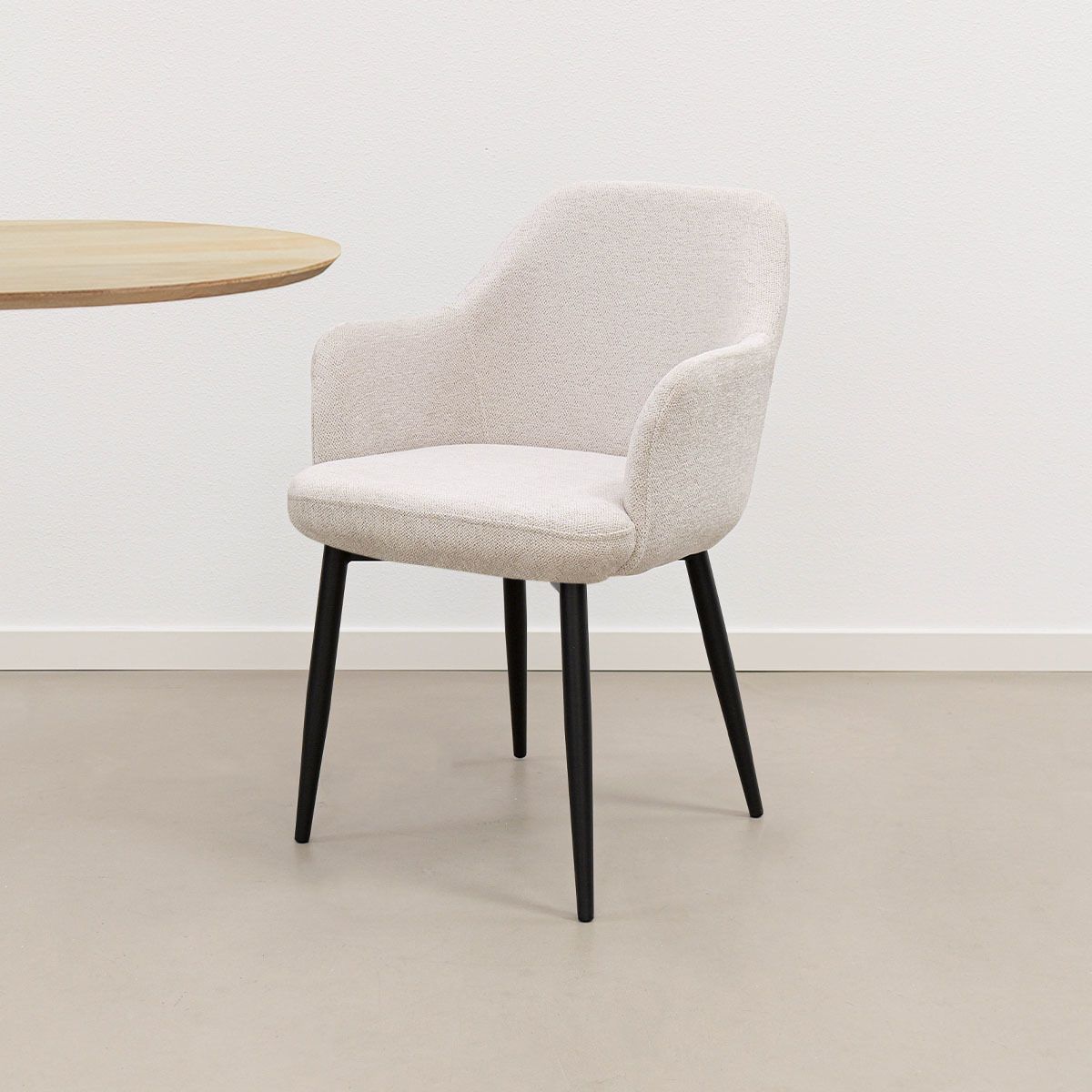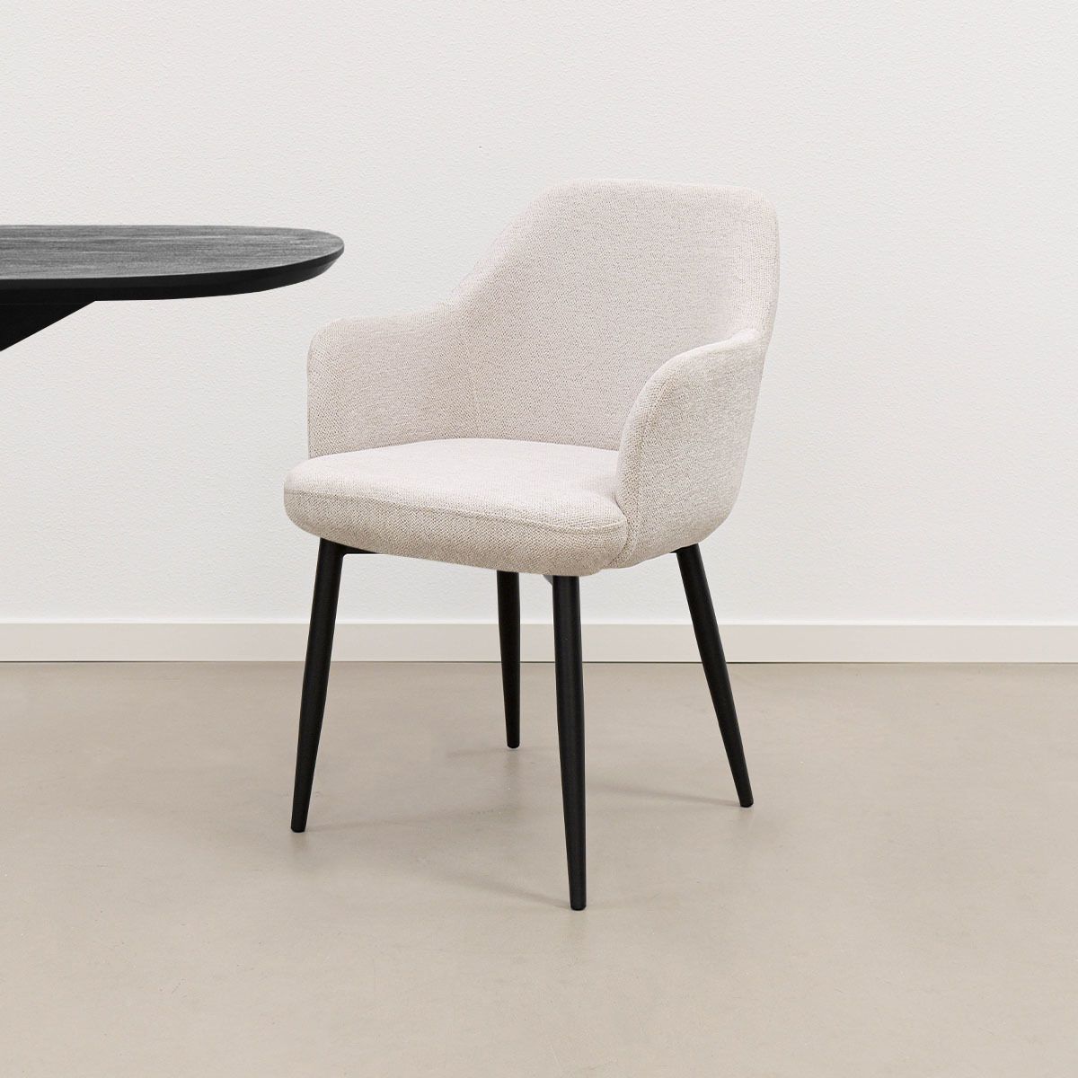 Der weiche Textilbezug fühlt sich angenehm an und verleiht JODI eine luxuriöse, einladende Ausstrahlung. Dank der großzügigen, bequemen Sitzfläche und den formschönen Armlehnen sitzen Sie immer entspannt, auch bei langen Abendessen. Das Metallgestell mit mattschwarzer Oberfläche sorgt für einen coolen Kontrast und rundet das schlichte Design ab. JODI ist in verschiedenen Farben erhältlich, sodass er sich mühelos in Ihren Einrichtungsstil einfügt.