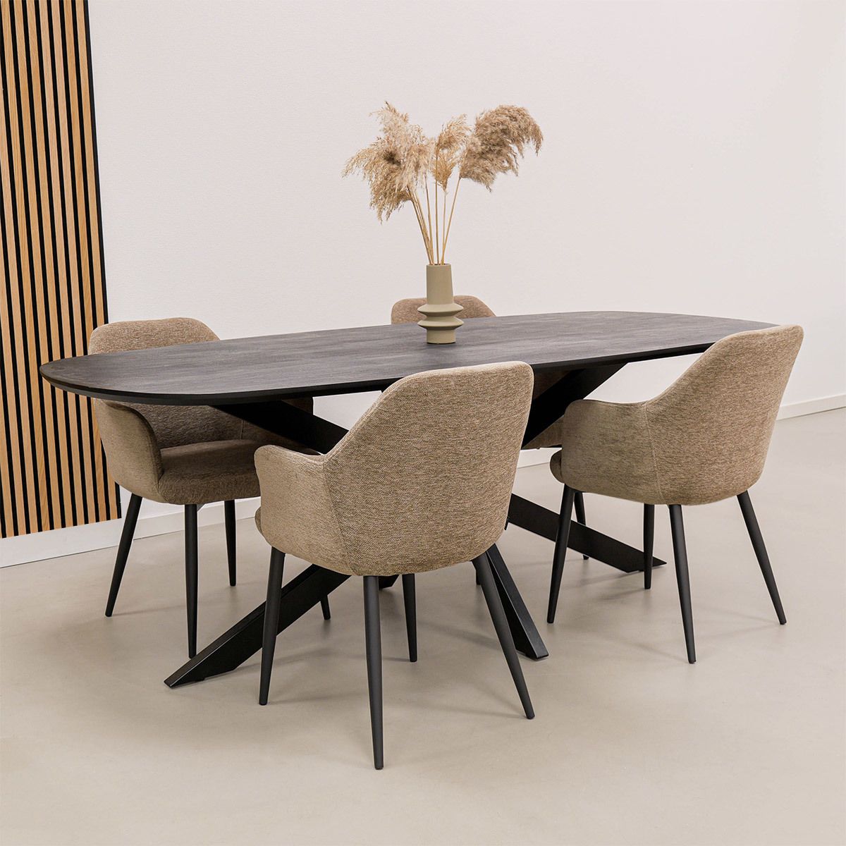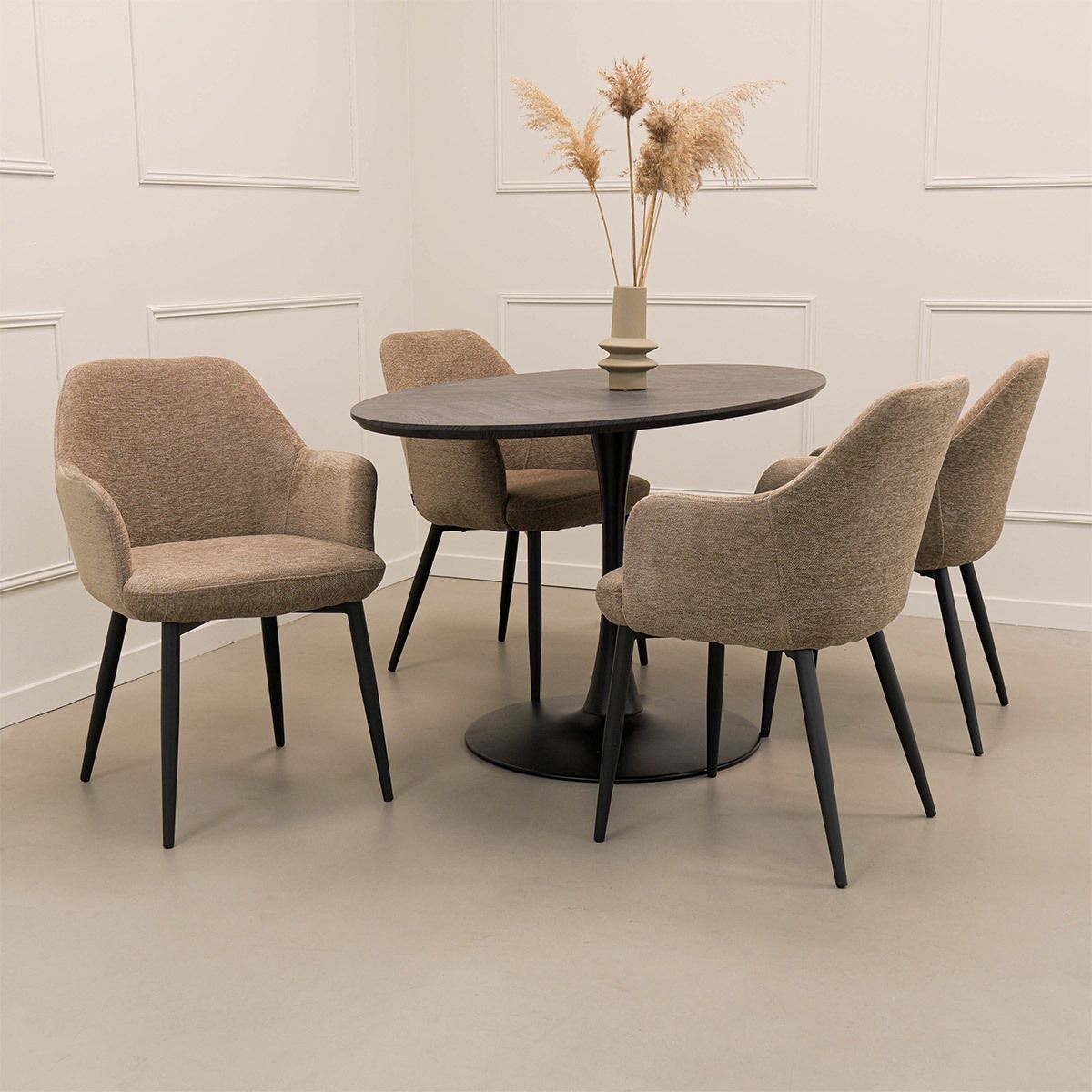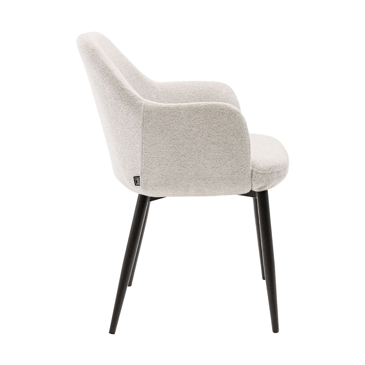 Der weiche Textilbezug fühlt sich angenehm an und verleiht JODI eine luxuriöse, einladende Ausstrahlung. Dank der großzügigen, bequemen Sitzfläche und den formschönen Armlehnen sitzen Sie immer entspannt, auch bei langen Abendessen. Das Metallgestell mit mattschwarzer Oberfläche sorgt für einen coolen Kontrast und rundet das schlichte Design ab. JODI ist in verschiedenen Farben erhältlich, sodass er sich mühelos in Ihren Einrichtungsstil einfügt.