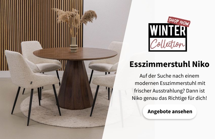 Weniger anzeigenDas Esszimmer ist ein Ort, an dem man viel Zeit verbringt, zum Beispiel beim Frühstück mit der Familie oder bei einem gemütlichen Abendessen mit Freunden. Deshalb möchte man auch bequem am Esstisch sitzen. Bei KICK Collection finden Sie eine große Auswahl an Esszimmerstühlen, auf denen es sich gut sitzen lässt. Unsere Esszimmerstühle sind robust, modern und in verschiedenen Farben erhältlich. Wählen Sie zum Beispiel Esszimmerstühle mit weißem Bouclé oder rosa Samtbezug. Weitere Optionen sind Esszimmerstühle mit Baumwollbezug, Stühle mit oder ohne Armlehnen oder Esszimmerstühle aus PU-Leder. Zu jedem Esstisch gibt es die passenden Stühle zu erschwinglichen Preisen.